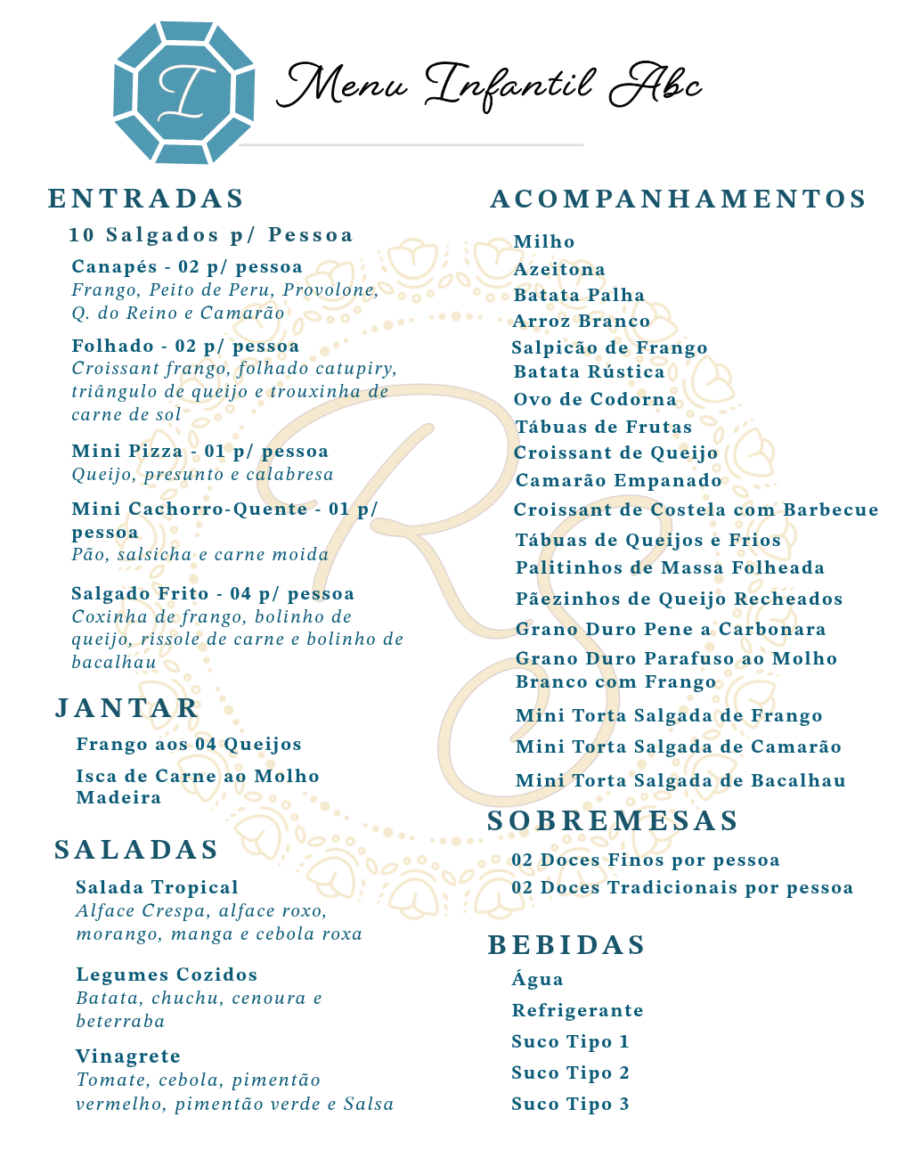 Trabalhamos com Buffet, Decoração e Espaço, que podem ser contratados como um pacote único ou separadamente.