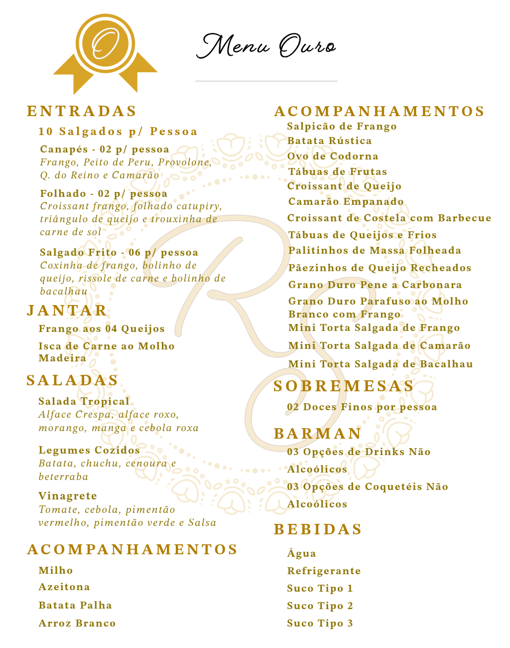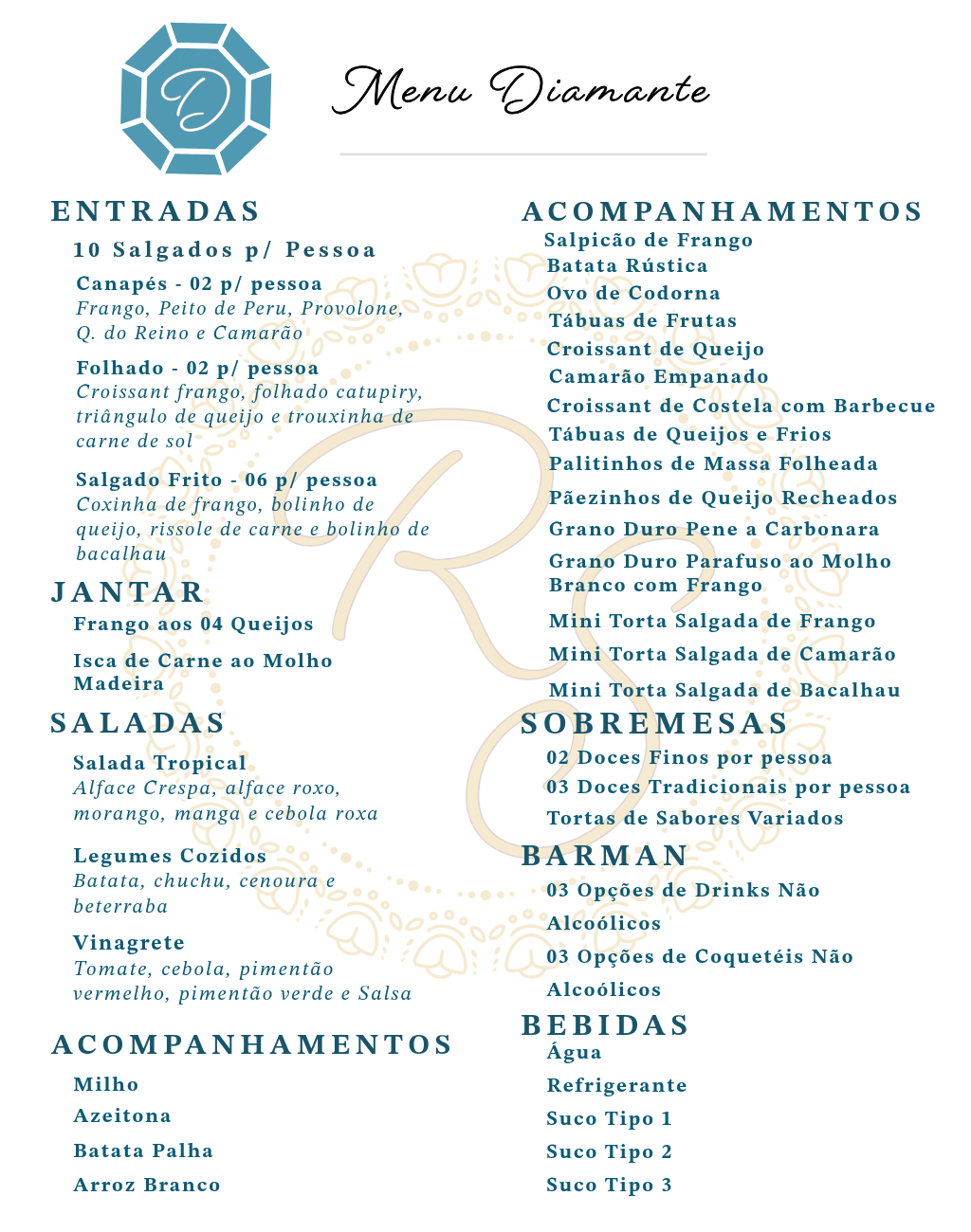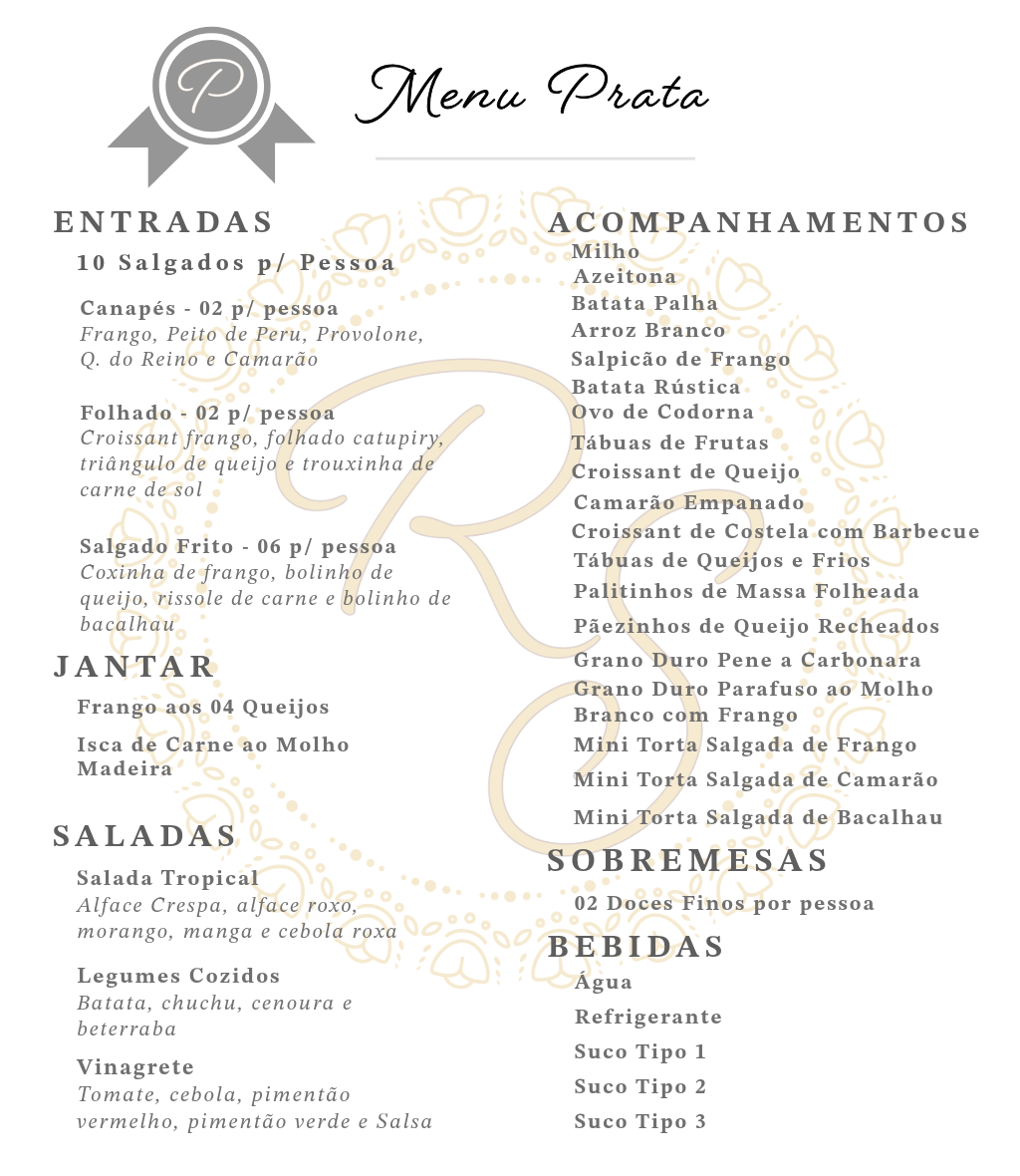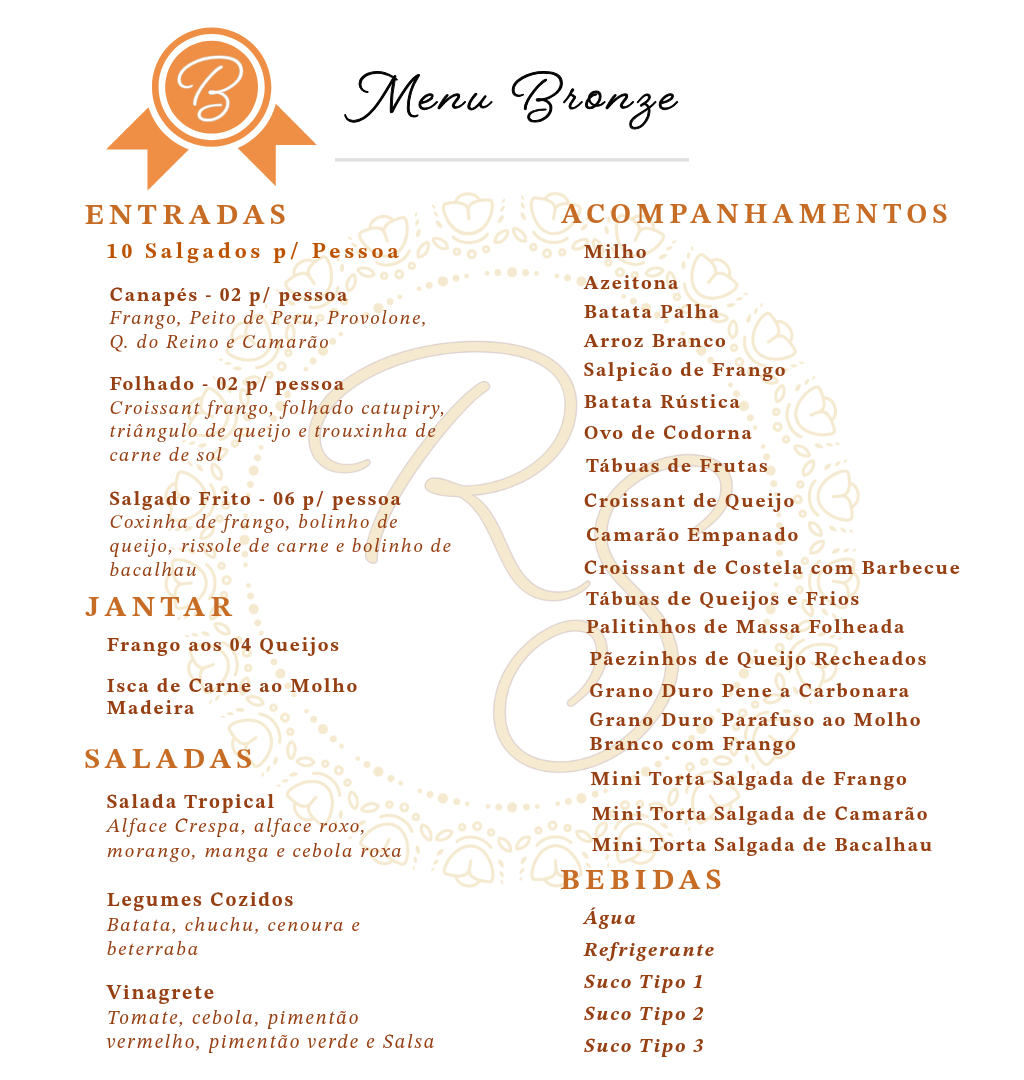 Nosso Buffet é dividido em categorias Bronze, Prata, Ouro e Diamante, e a Decoração em Simples e Personalizada, oferecendo uma ampla variedade de opções para o seu evento.